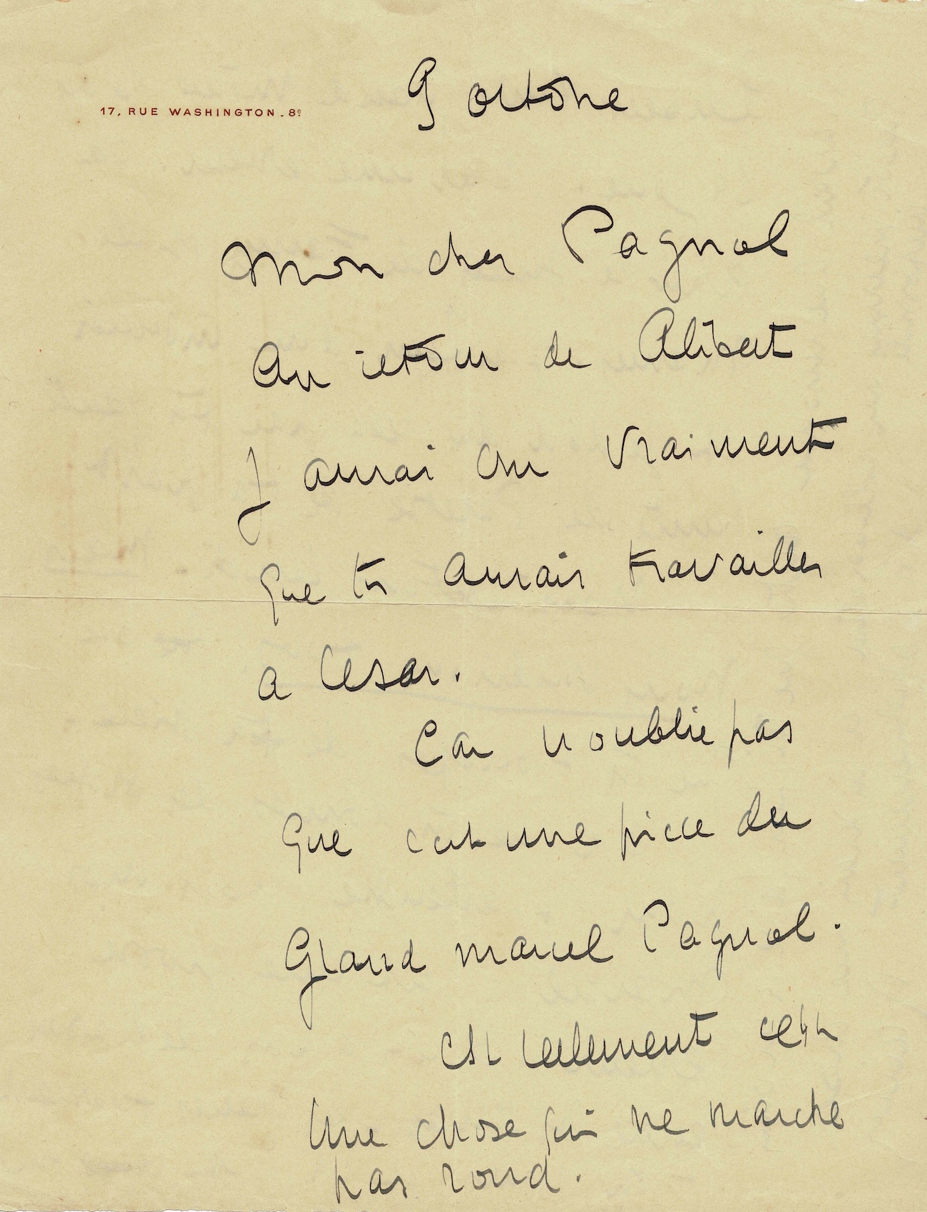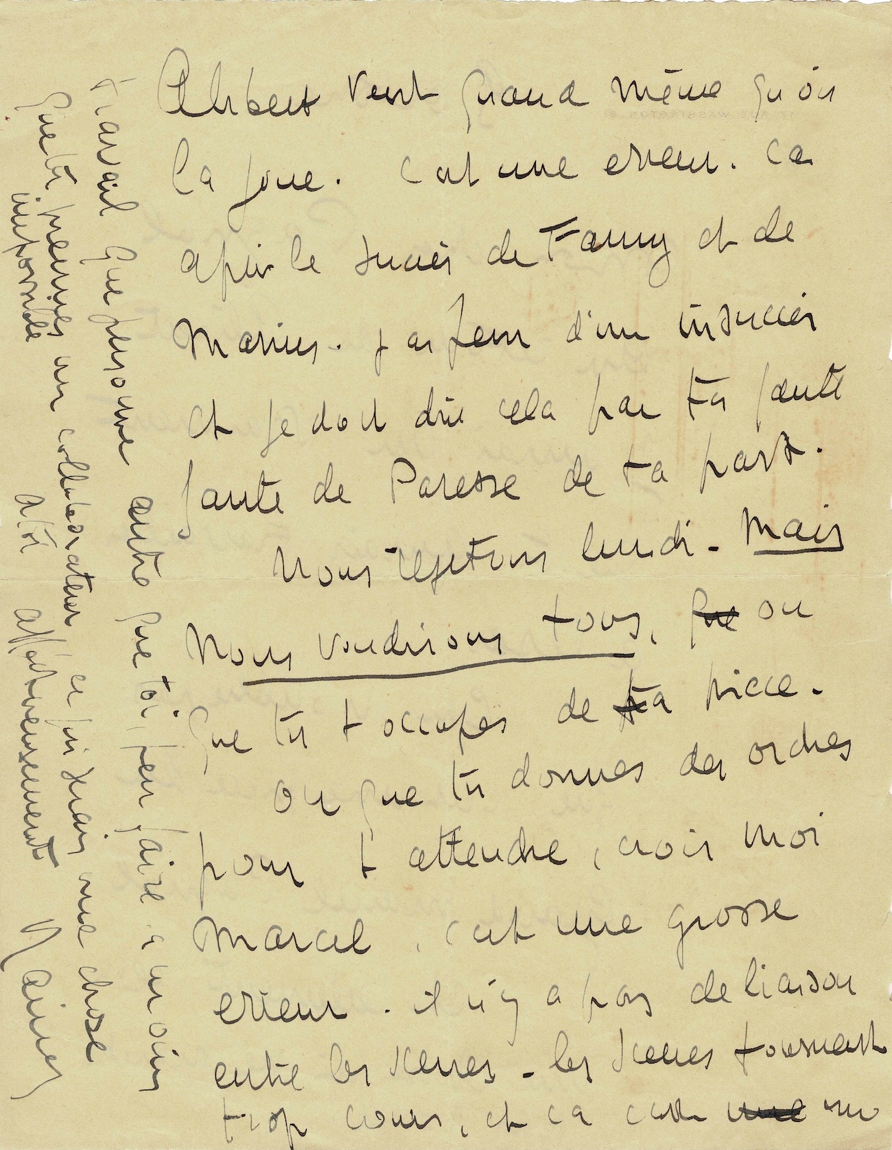 Nous répétons lundi. Mais nous voudrions tous, ou que tu t’occupes de ta pièce, ou que tu donnes des ordres pour t’attendre : crois moi Marcel, c’est une grosse erreur. Il n’y a pas de liaison entre les scènes. Les scènes tournent trop court, et ça c’est un travail que personne autre que toi, peu [sic] faire. À moins que tu prennes un collaborateur, ce qui serait une chose impossible. A toi. Affectueusement Raimu »