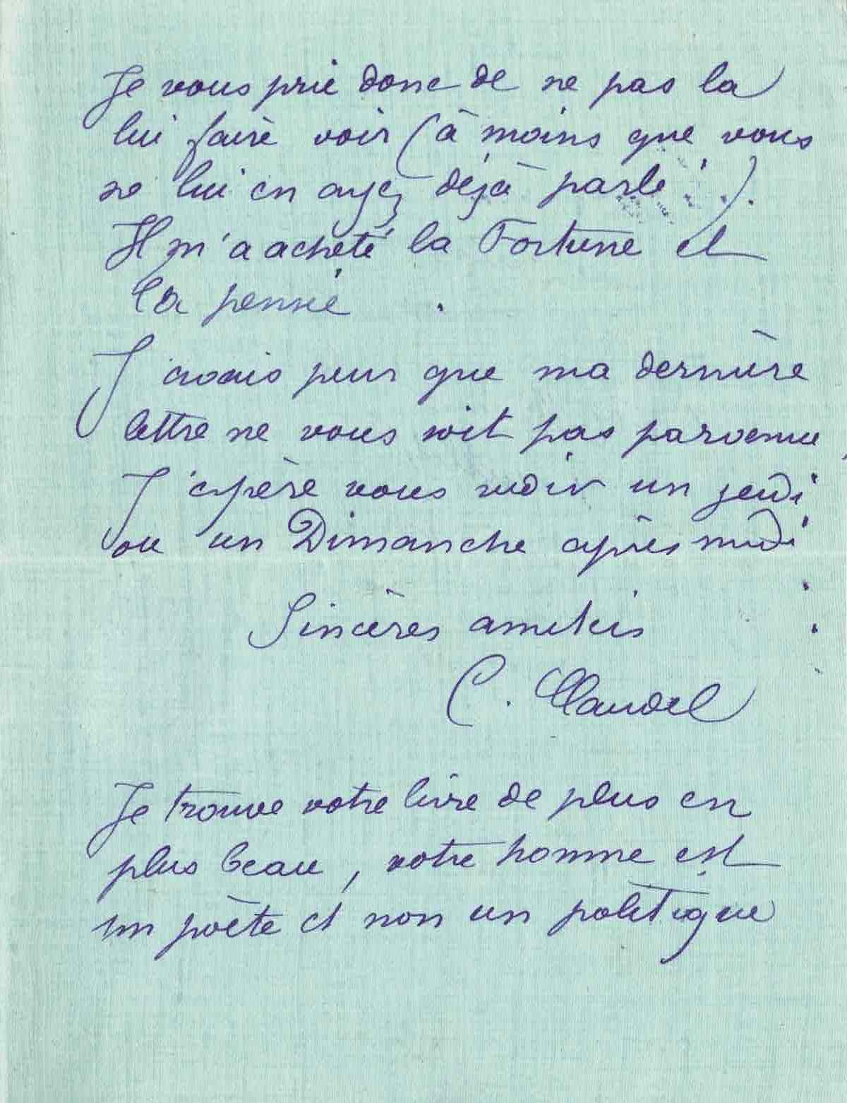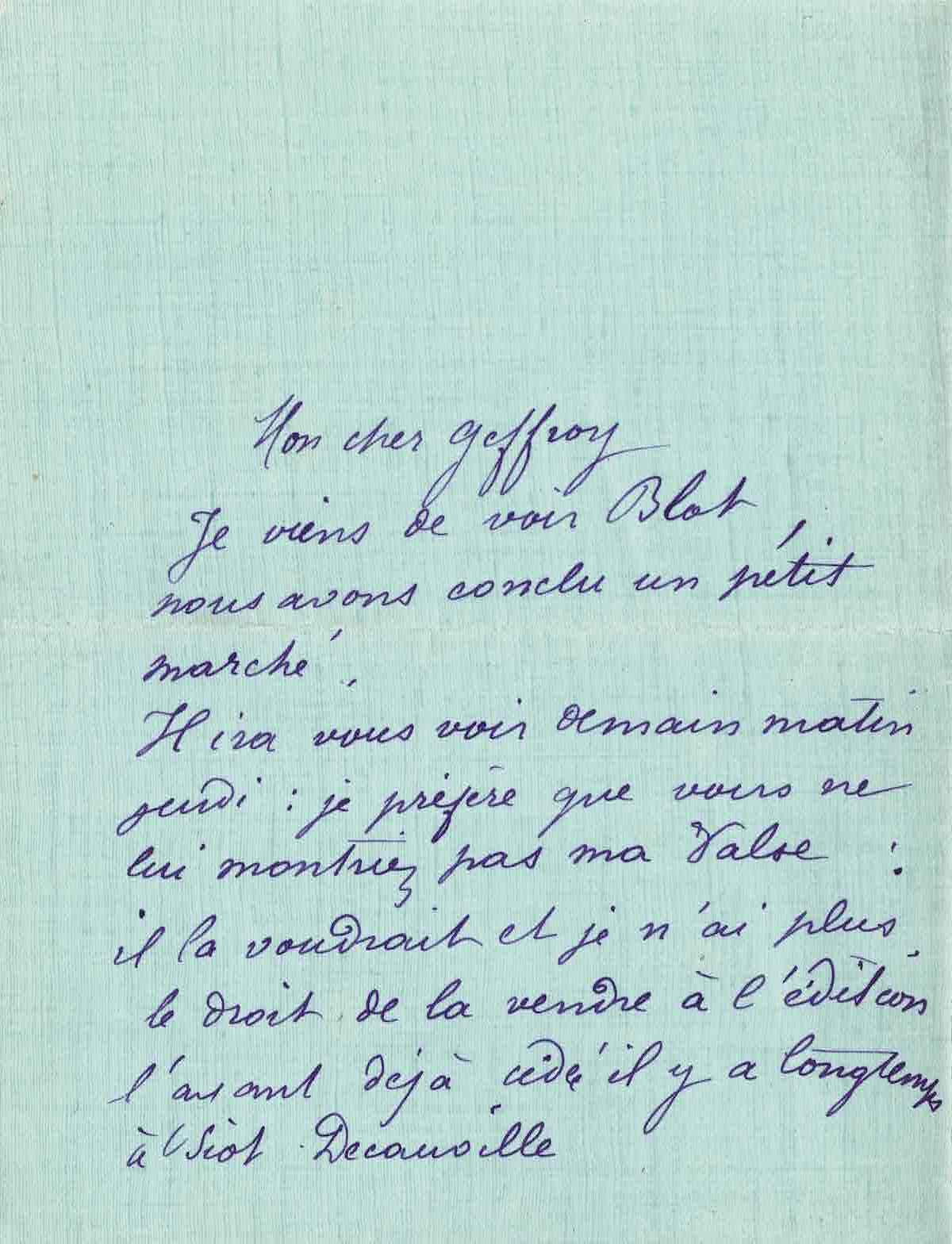 « Mon cher Geffroy, Je viens de voir Blot, nous avons conclu un petit marché. Il ira vous voir demain matin jeudi : je préfère que vous ne lui montriez pas ma Valse ; il la voudrait et je n’ai plus le droit de la vendre à l’édition l’ayant déjà cédée il y a longtemps à Siot-Decauville. Je vous prie donc de ne pas la lui faire voir (à moins que vous ne lui en ayez déjà parlé). Il m’a acheté la Fortune et la Pensée. J’avais peur que ma dernière lettre ne vous soit pas parvenue. J’espère vous voir un jeudi ou un dimanche après-midi. Sincères amitiés. C. Claudel. Je trouve votre livre de plus en plus beau, votre homme est un poète et non un politique [L’Enfermé, biographie d’Auguste Blanqui par Geffroy].